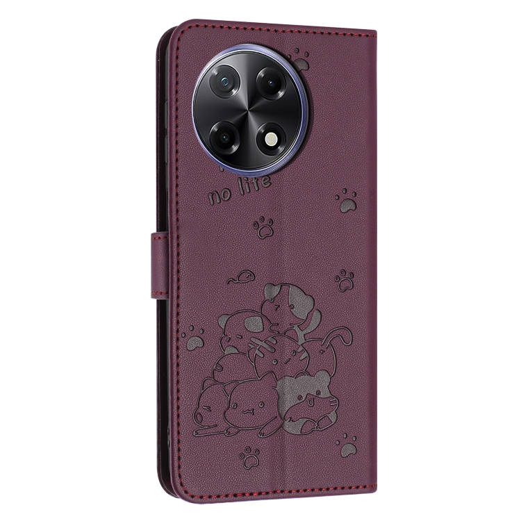Funda de Piel para Tecno Camon 30S con Diseño de Gatito en Relieve y Cordón (Rojo Vino)