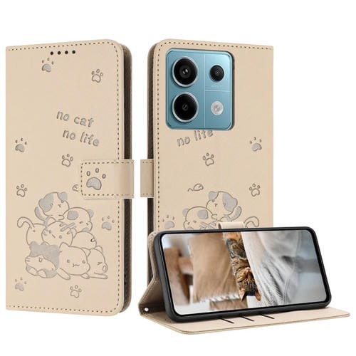 Funda de Piel con Diseño de Gatito En Relieve y Cordón para Xiaomi Poco X6 5G (Beige)