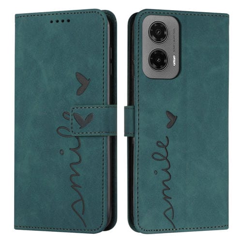 Funda de Piel con Relieve de Corazón para Motorola Moto G35 con Cordón Largo (Verde)