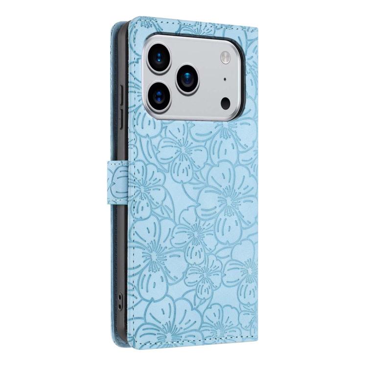 Funda de piel con relieve de flores de cerezo para iPhone 17 Pro Max (azul claro)