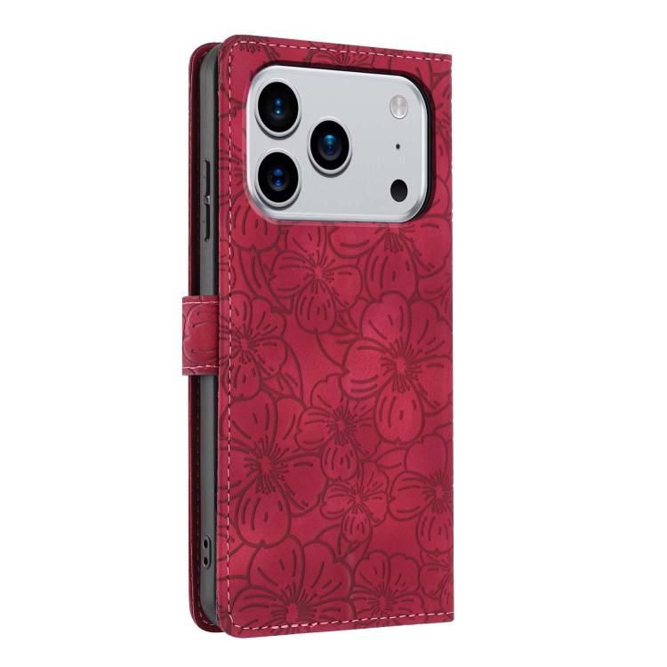 Funda de piel con relieve de flores de cerezo para iPhone 17 Pro Max (roja)
