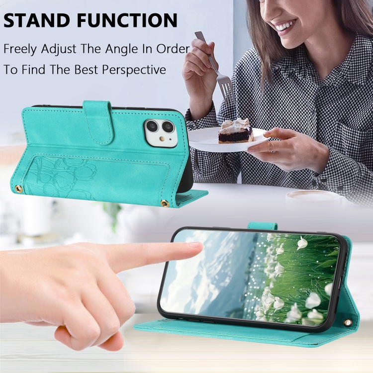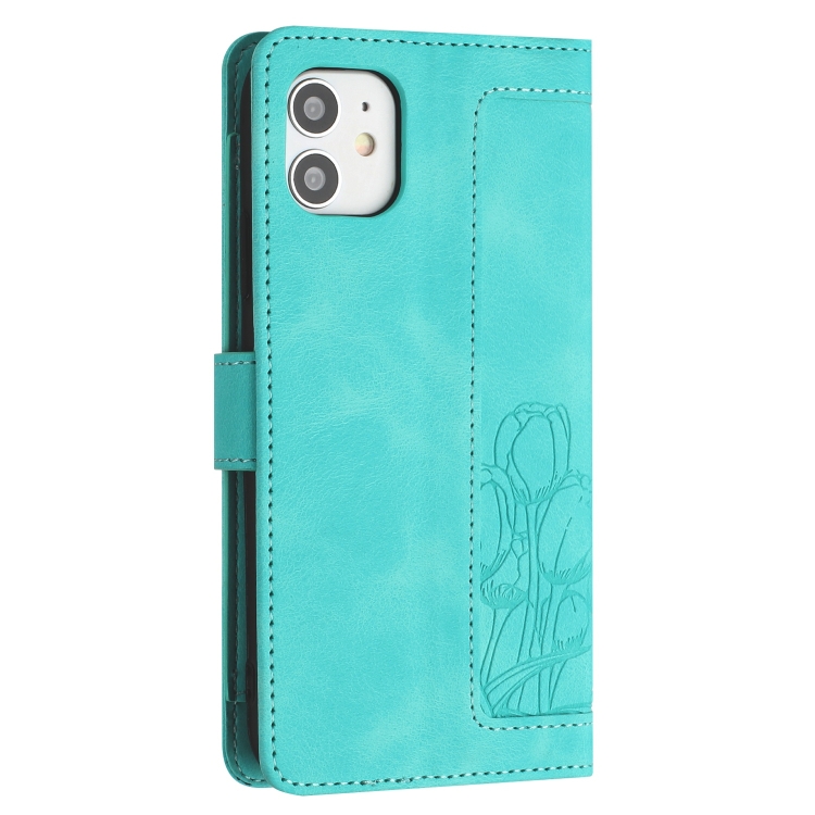 Funda de Piel con Relieve de Tulipanes para iPhone 12 Mini con Cordón (Verde)