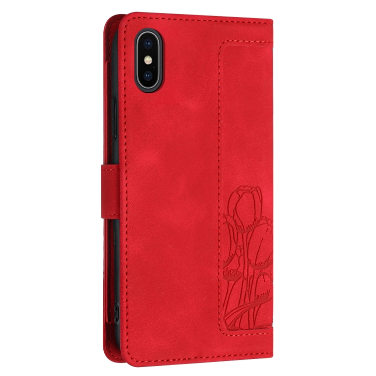 Funda de Piel con Relieve de Tulipanes para iPhone Xs Max con Cordón (Rojo)
