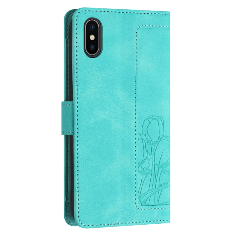 Funda de Piel con Relieve de Tulipanes para iPhone Xs Max con Cordón (Verde)