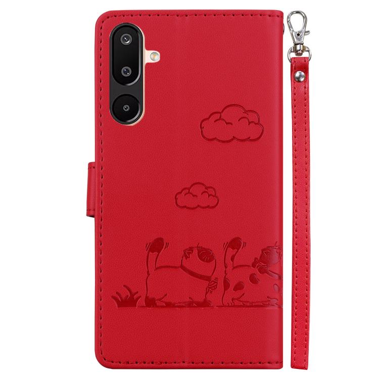 Funda de piel con RFID y diseño de gatos para Samsung Galaxy M16 5G / F16 5G / M36 5G (roja)