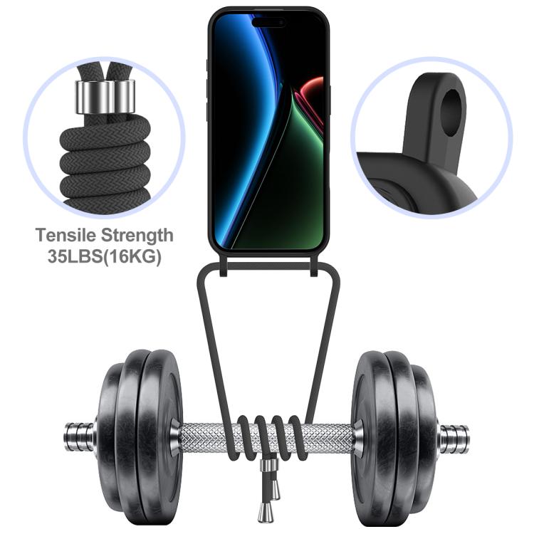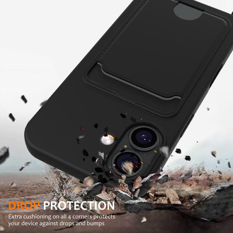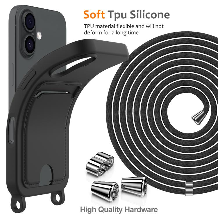 Funda de silicona líquida de color sólido con tarjetero integrado para iPhone 17 y cordón (negra)