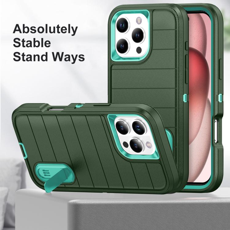 Funda de Silicona y PC Defender Gen2 para iPhone 16 Pro Max con Soporte (Verde Oscuro y Cian)