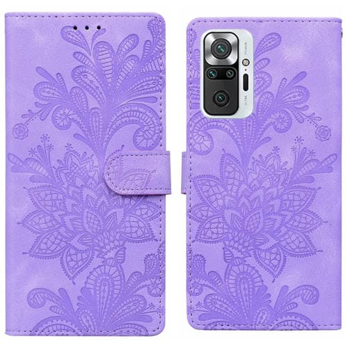 Funda de Teléfono con Hebilla Magnética de Pu con Encaje Floral En Relieve y Correa para la Muñeca para Redmi Note 10 Pro 4G (Púrpura)