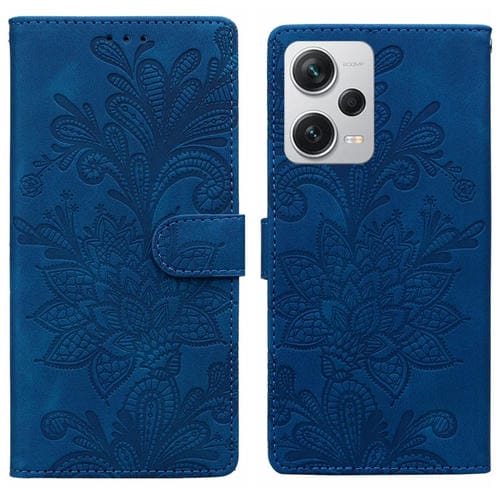 Funda de Teléfono con Hebilla Magnética y Encaje Floral En Relieve para Redmi Note 12 Pro+ 5G Global con Correa para la Muñeca (Azul)