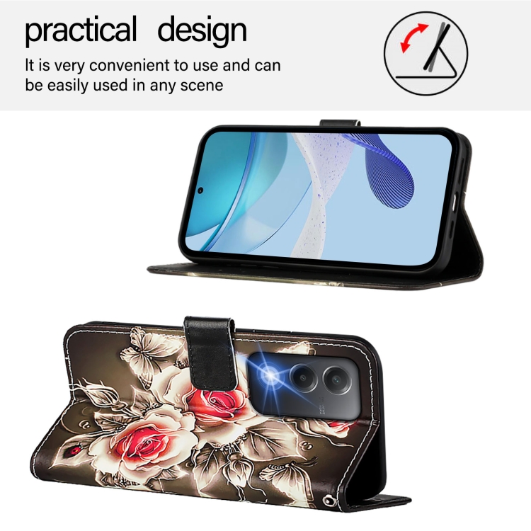 Funda de Teléfono de Cuero con Patrón de Dibujo de Colores y Tejido Liso para Oppo A80 5G Versión UE (Rosas Sobre Negro)
