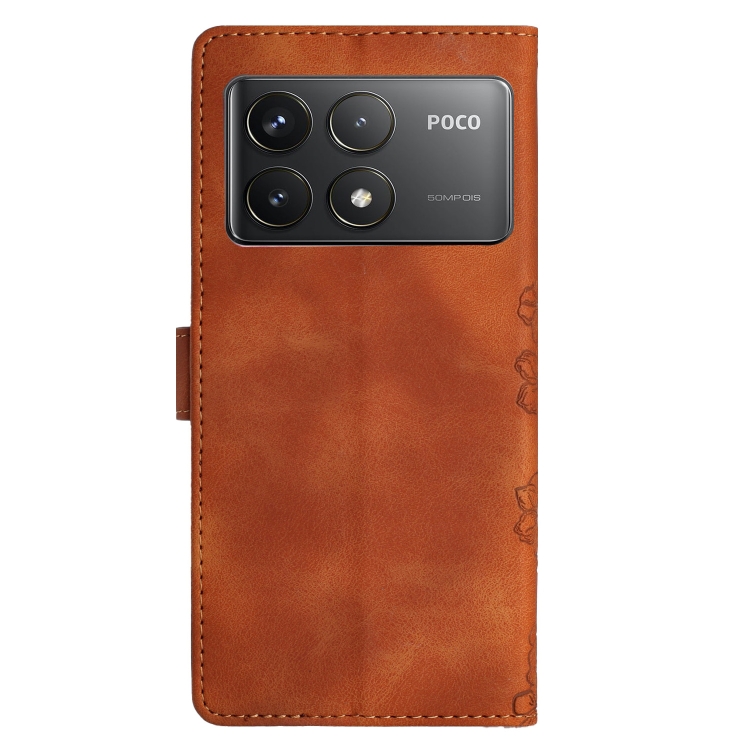 Funda de Teléfono de Pu con Relieve de Piel de Mariposa y Diseño de Flor de Cerezo para Xiaomi Poco F6 Pro (Marrón)