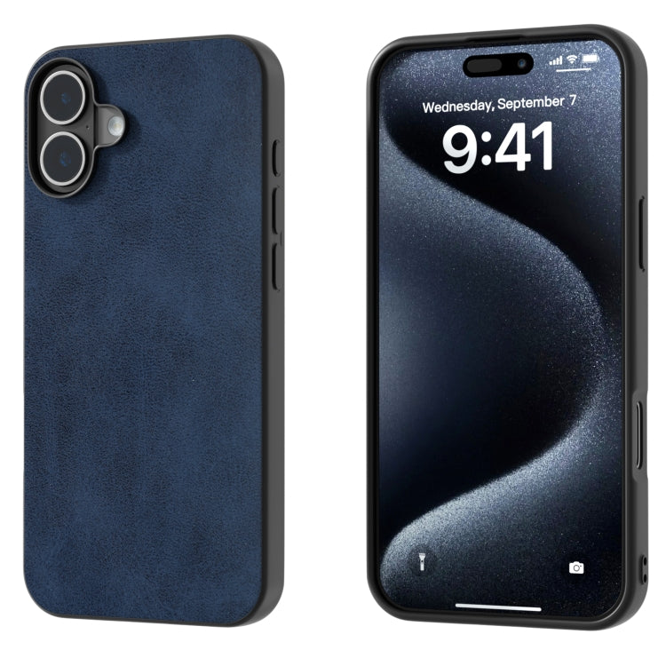 Funda de teléfono PU textura de becerro dos colores marco negro para iPhone 16 (Azul)