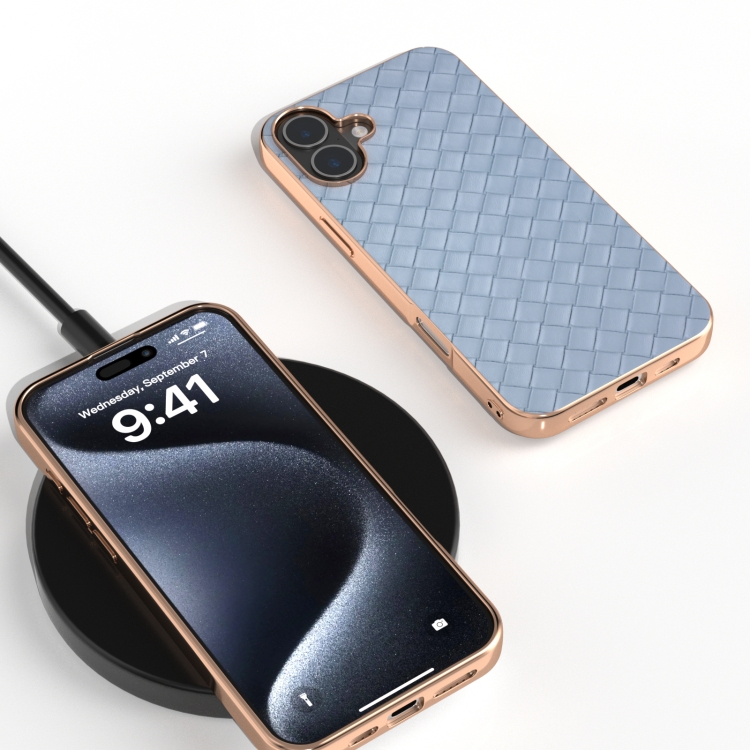 Funda de teléfono PU con textura tejida y marco galvanizado para iPhone 16 (Azul Claro)