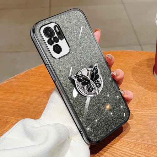 Funda de Teléfono de TPU con Soporte de Mariposa con Purpurina Degradada Chapada para Redmi Note 10 4G (Negro)