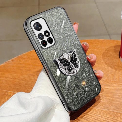 Funda de Teléfono de TPU con Soporte de Mariposa con Purpurina Degradada Chapada para Redmi Note 11 5G (Negro)
