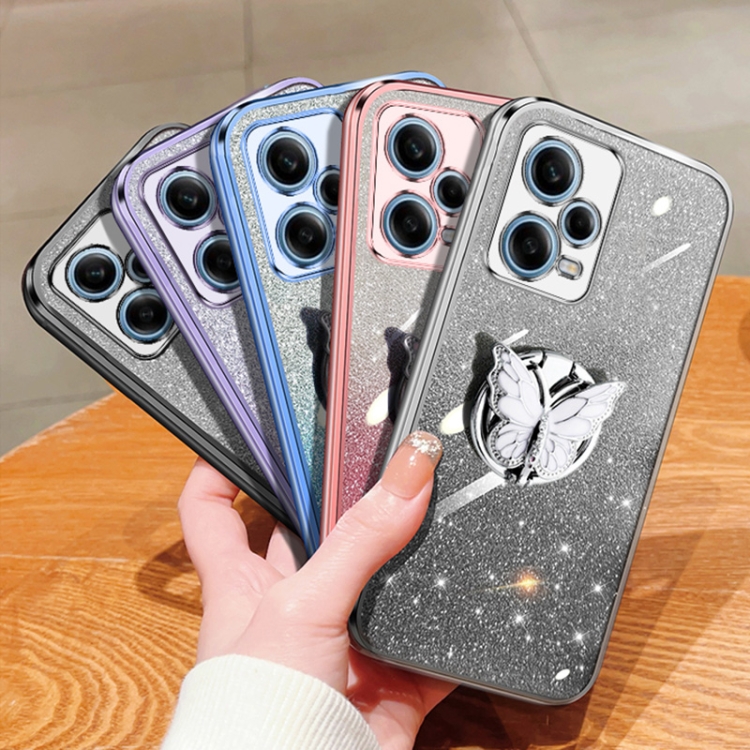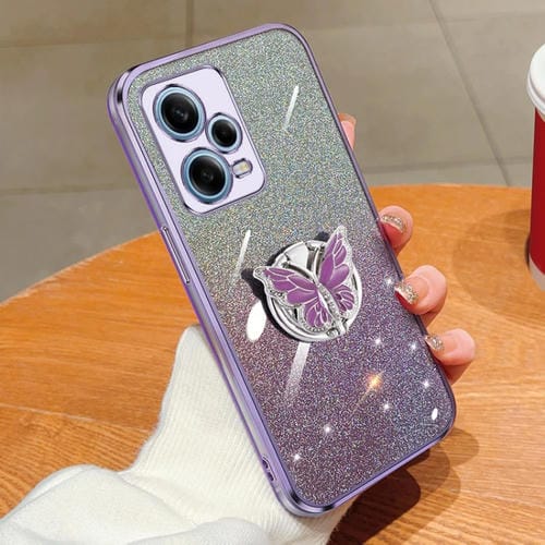 Funda de Teléfono de TPU con Soporte para Mariposa con Purpurina Degradada y Revestimiento Global para Redmi Note 12 Pro 5G (Morado)