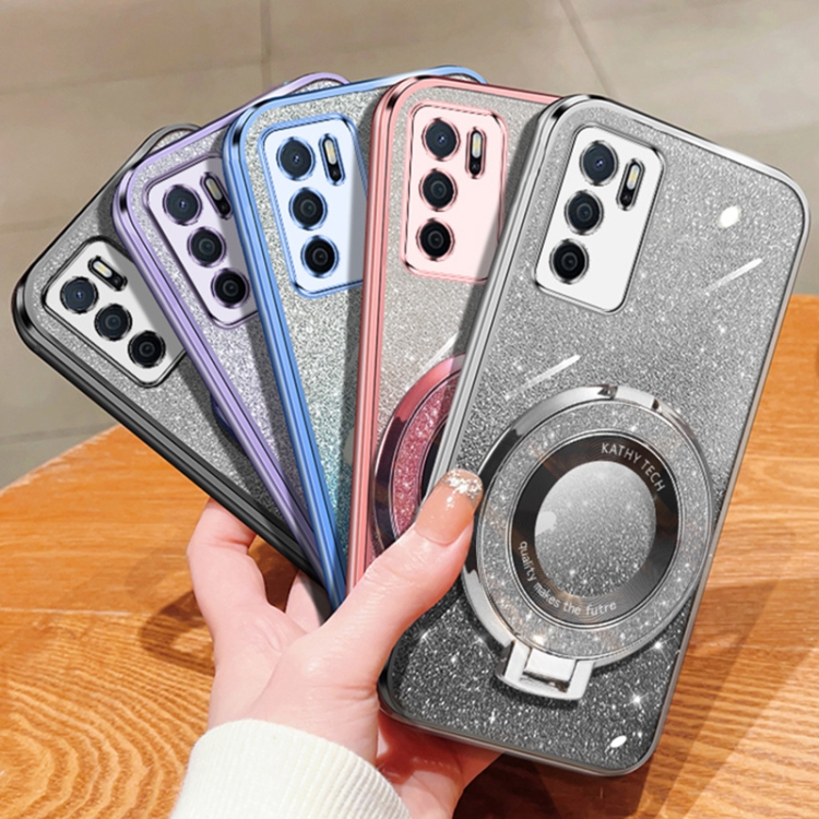 Funda de Teléfono de TPU con Soporte Redondo y Purpurina Degradada Plateada para Oppo A16 (Morado)