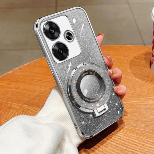 Funda de Teléfono de TPU con Soporte Redondo y Purpurina Degradada Plateada para Redmi Turbo 3 (Plateada)
