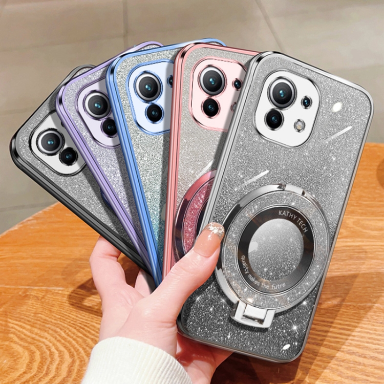 Funda de Teléfono de TPU con Soporte Redondo y Purpurina Degradada Plateada para Xiaomi Mi 11 (Plateada)