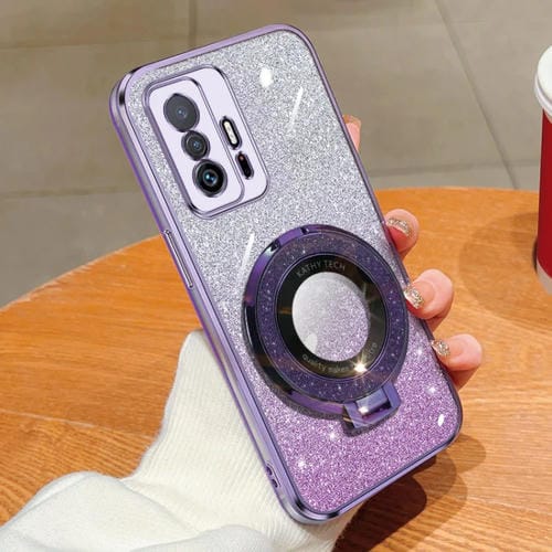 Funda de Teléfono de TPU con Soporte Redondo y Purpurina Degradada Plateada para Xiaomi Mi 11T / 11T Pro 5G (Morado)