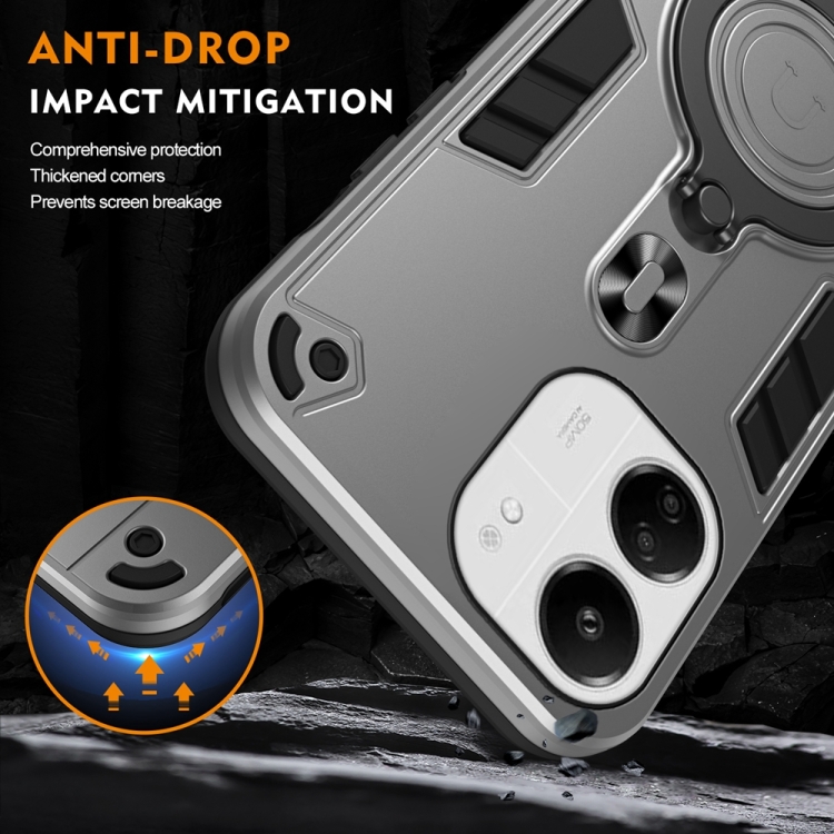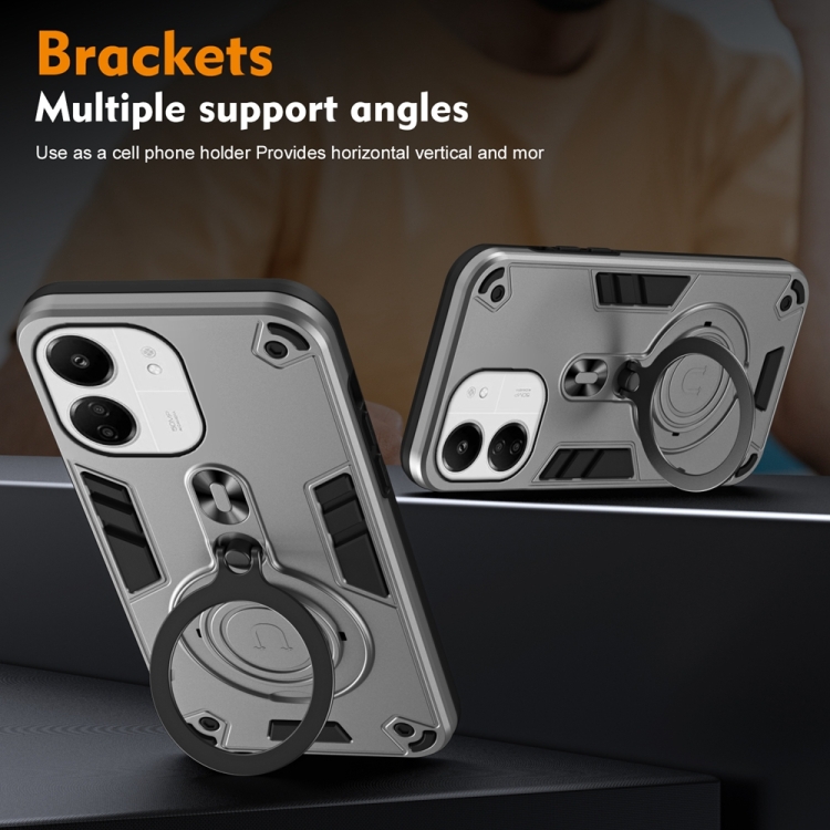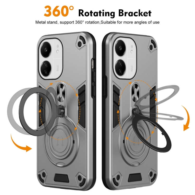 Funda de Teléfono Híbrida de TPU y PC con Soporte Giratorio de 360 Grados y Anillo de Metal para Redmi 13C 4G/5G (Gris Plateado)