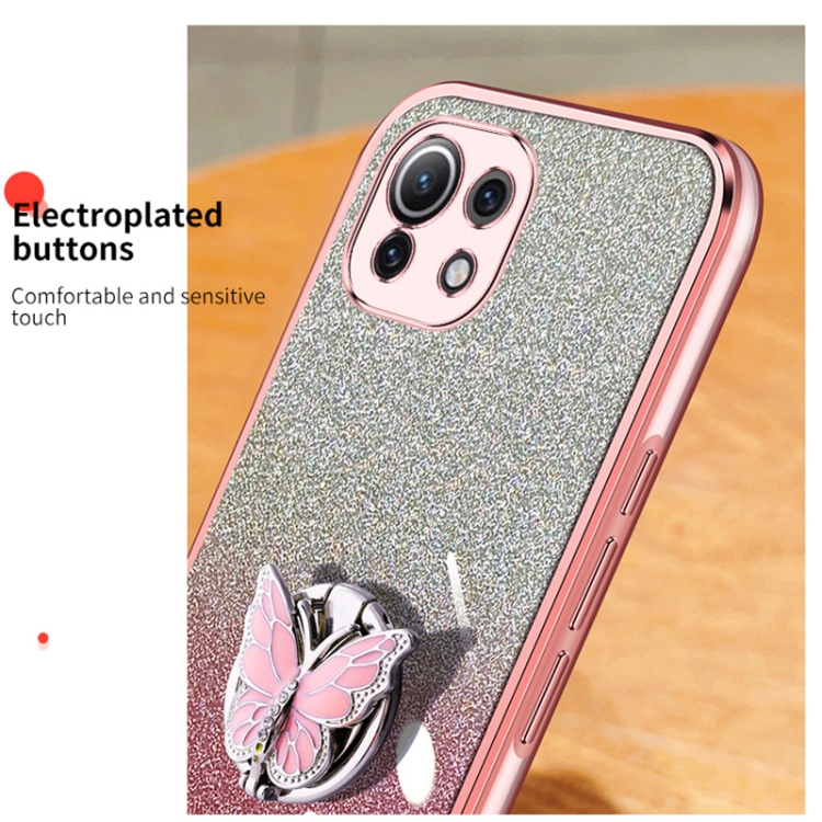 Funda de TPU con Soporte para Mariposa con Purpurina Degradada Plateada para Xiaomi Mi 11 Lite (Morado)