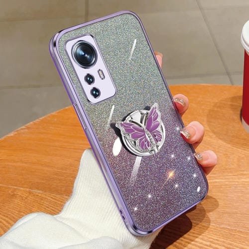 Funda de TPU para Teléfono con Soporte de Mariposa con Purpurina Degradada Plateada para Xiaomi 12 (Morado)