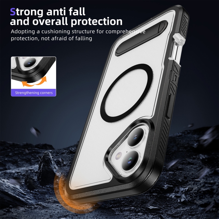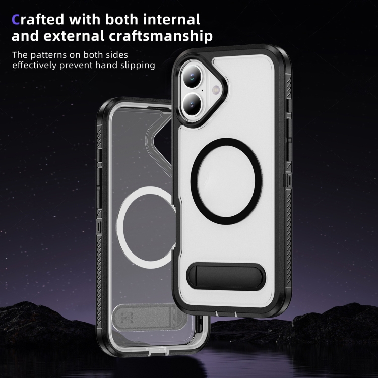 Funda híbrida TPU y PC con soporte Magsafe para iPhone 16 Plus (Negra Transparente)