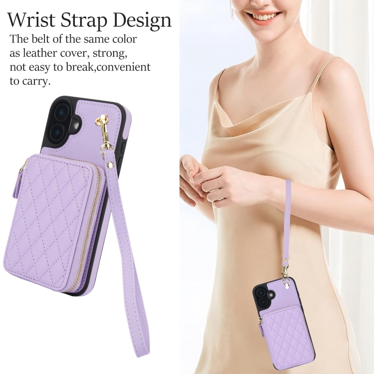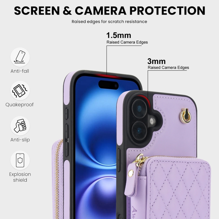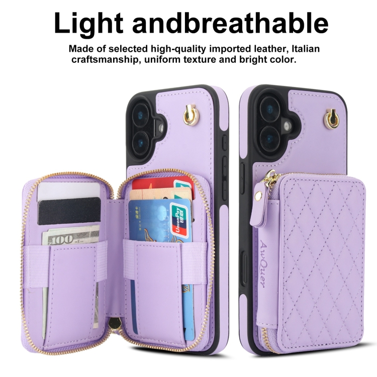 Funda para iPhone 16 Awquer con Cremallera Cruzada y Parte Trasera de Cuero con Diseño de Rombos (Morado)
