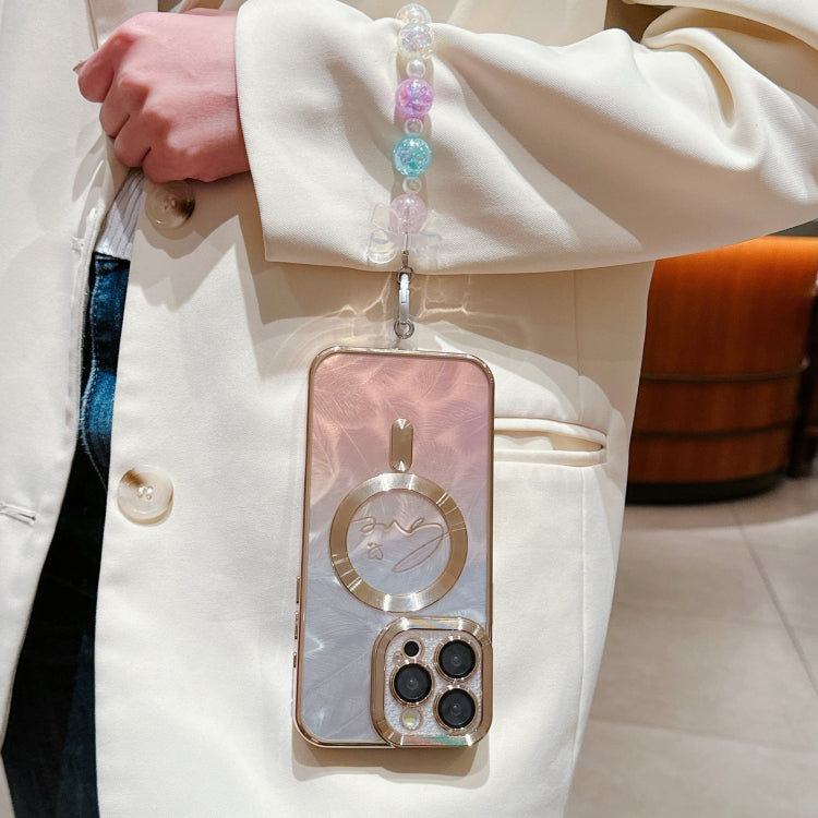 Funda para iPhone 16 con Purpurina y Degradado de Plumas y Doble Amor con Magsafe (Dorado)