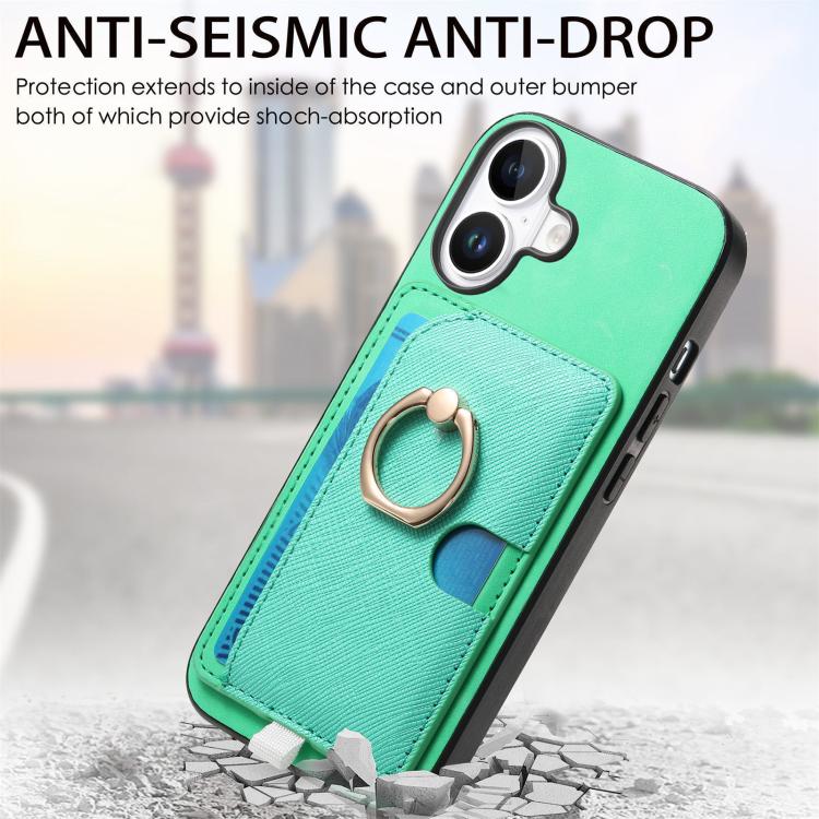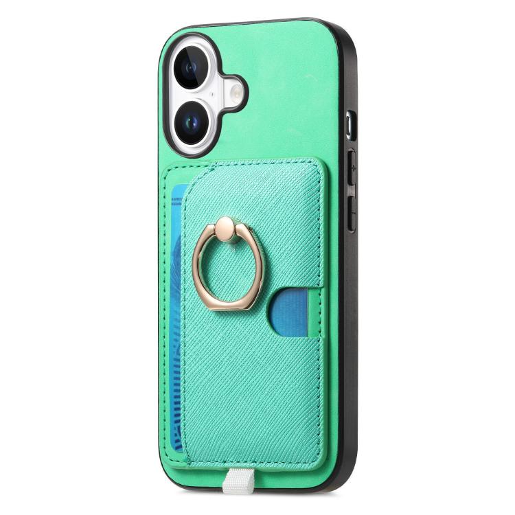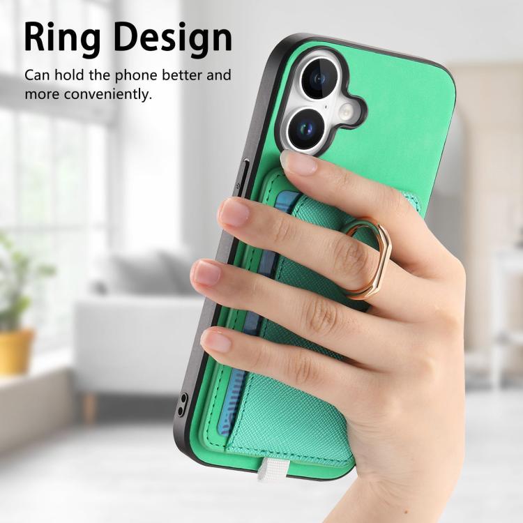 Funda para iPhone 16 con Ranuras para Tarjetas y Anillo de Cuero Retro con Inserción Cruz Magsafe (Verde)