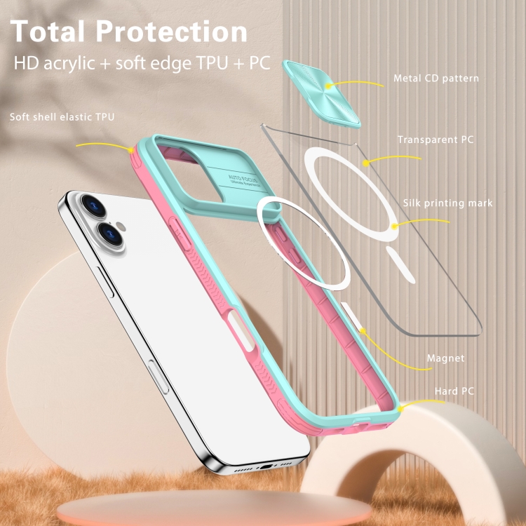 Funda para iPhone 16 Plus Cobertura Total Cubierta Deslizante Lente Magsafe Acrílico (Azul y Rosa)