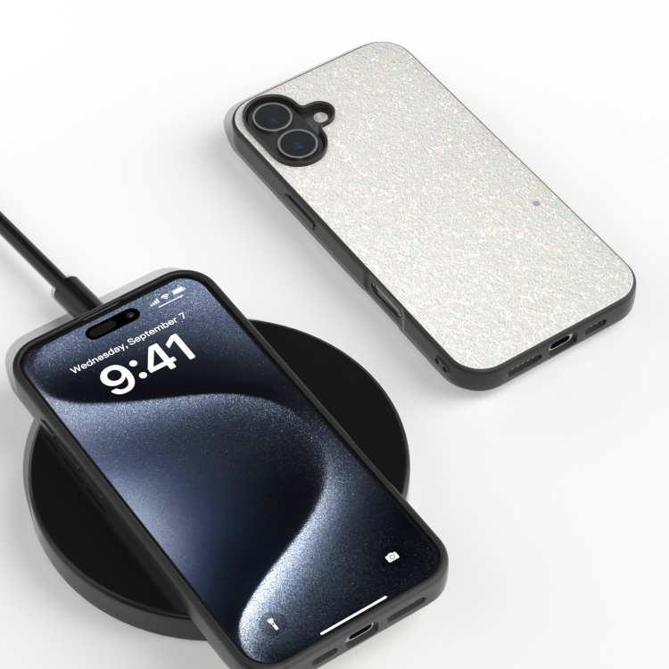 Funda para iPhone 16 Plus con Marco Negro y Purpurina de Colores (Blanca)