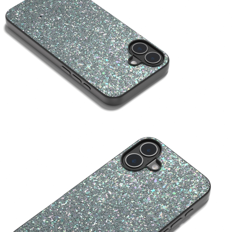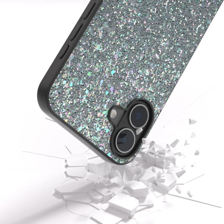 Funda para iPhone 16 Plus con Marco Negro y Purpurina de Colores (Negro y Verde)
