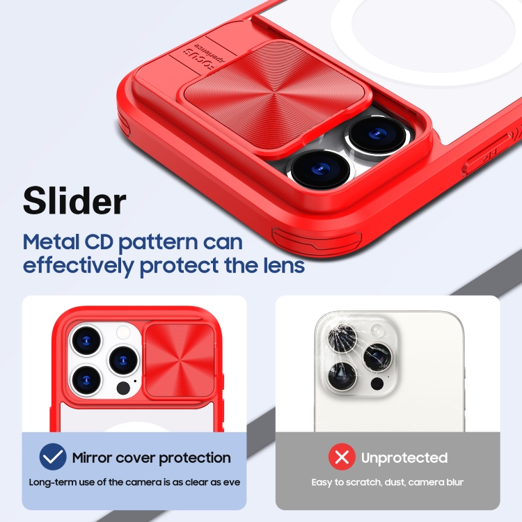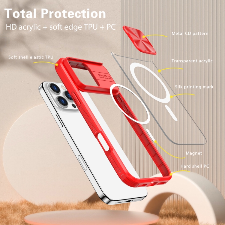 Funda para iPhone 16 Pro Cubierta Deslizante Acrílico Transparente PC TPU Magsafe (Rojo Chino)