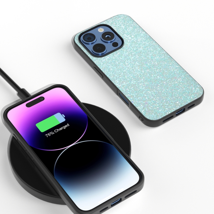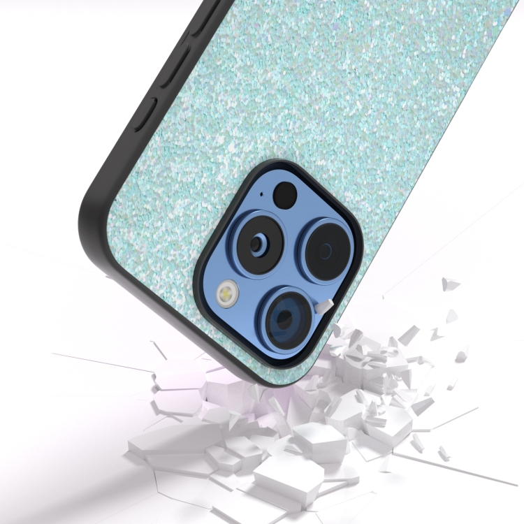 Funda para iPhone 16 Pro Max con Marco Negro y Purpurina de Colores (Verde Claro)