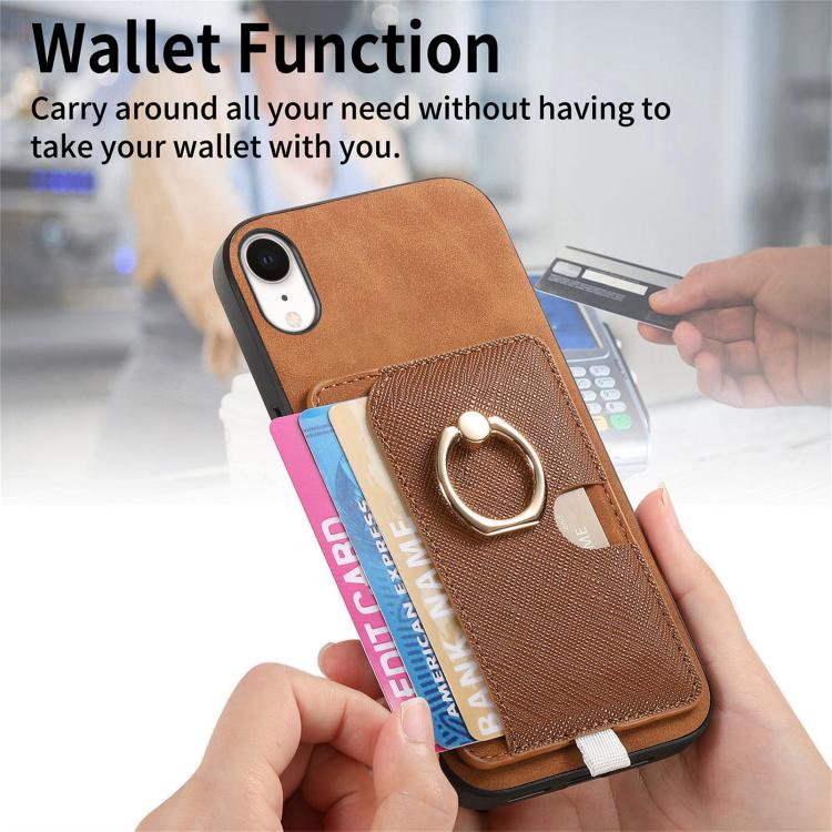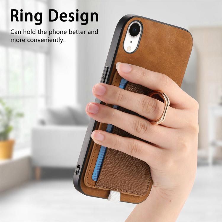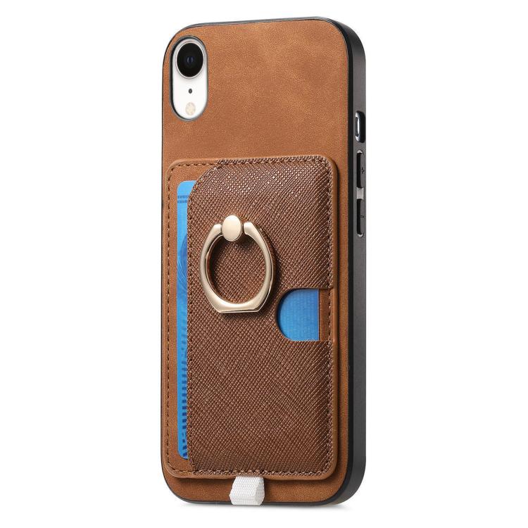 Funda para iPhone Xr Cuero con Ranuras para Tarjetas y Anillo Diseño Retro (Marrón)