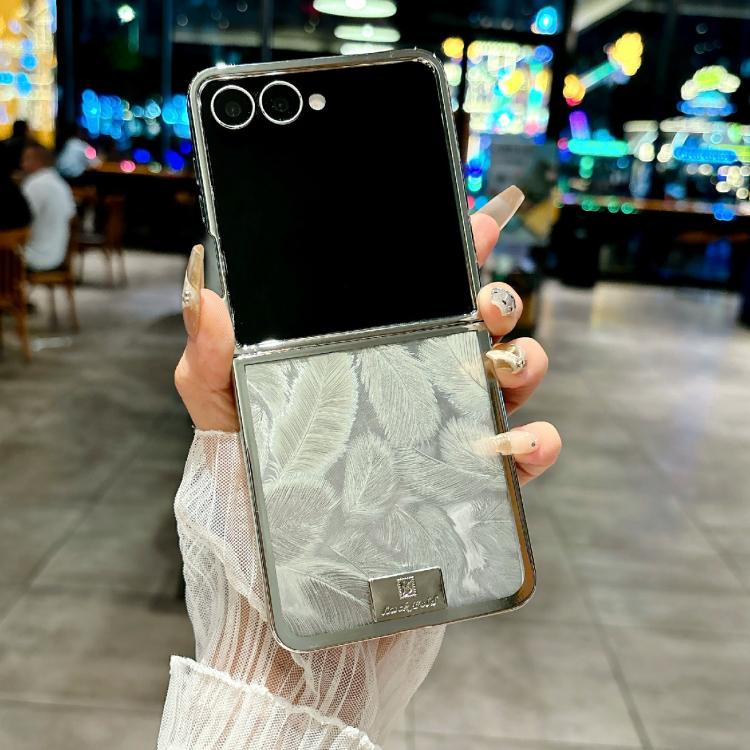 Funda para Samsung Galaxy Z Flip5 con marco chapado, placa de identificación de papel brillante, cobertura total (pluma plateada)