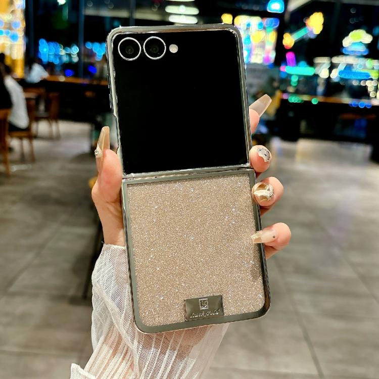 Funda para Samsung Galaxy Z Flip7 5G con marco chapado, placa de identificación de papel brillante y cobertura total (dorada)