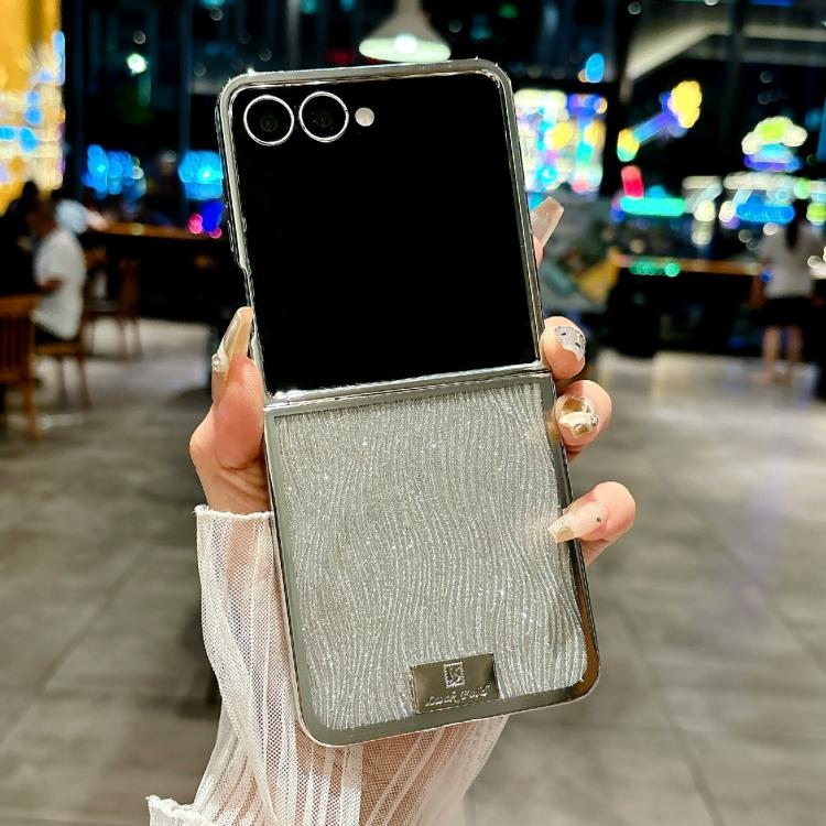 Funda para Samsung Galaxy Z Flip7 5G con marco chapado, placa de identificación de papel brillante y cobertura total (plata ondulada)