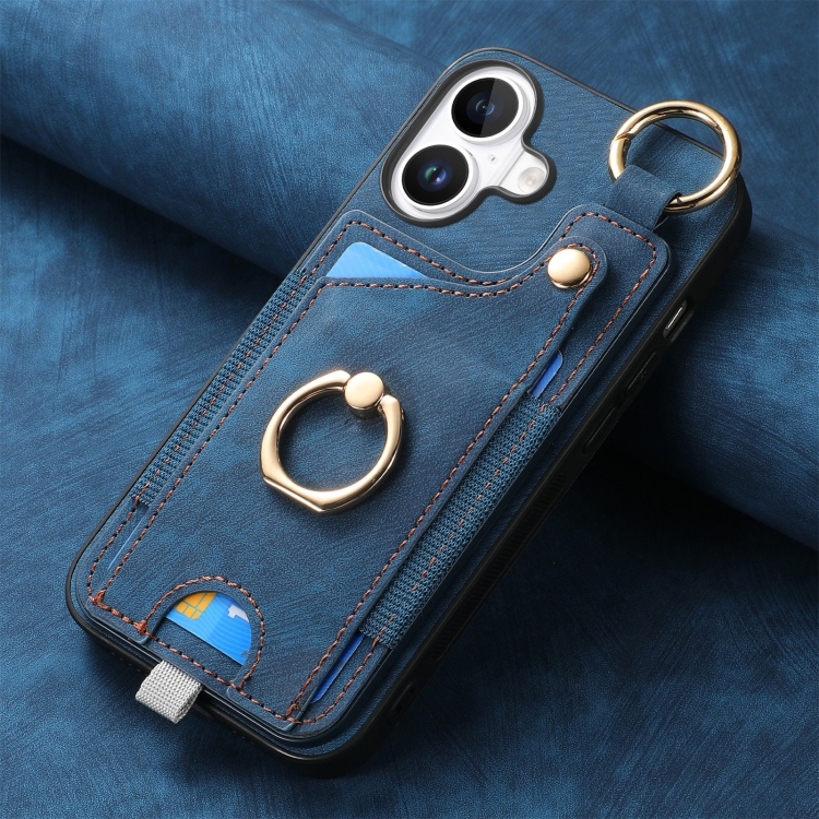 Funda para Teléfono iPhone 16 Plus con Anillo y Tarjetero Estilo Retro con Asa (Azul)