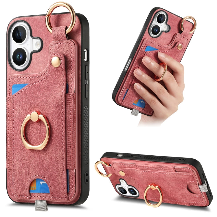 Funda para Teléfono iPhone 16 con Anillo y Tarjetero Estilo Retro con Asa (Rosa)