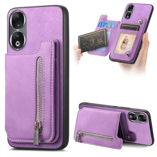 Funda para Teléfono Honor 90 con Cremallera Magsafe Retro, Tarjetero, Cartera (Morado)