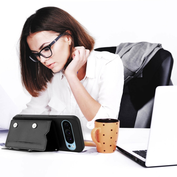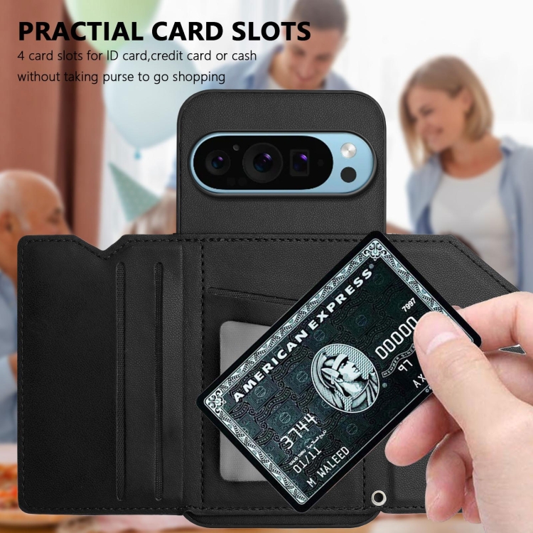 Funda para Teléfono Google Pixel 9 Pro Skin Feel con 4 Ranuras para Tarjetas y Correa para Muñeca (Negra)