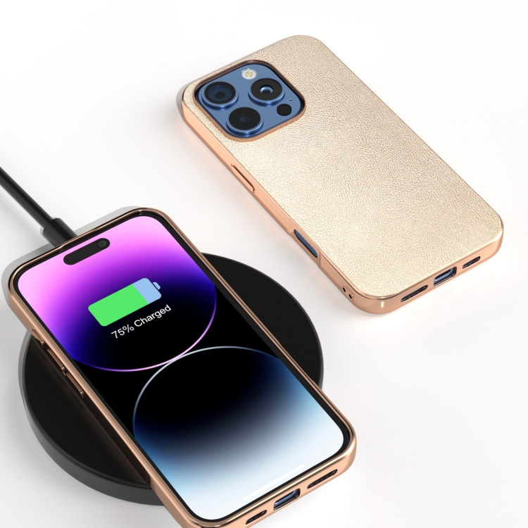 Funda para Teléfono iPhone 16 Pro Marco Galvanizado Cuero Sintético Cobertura Total (Dorada)