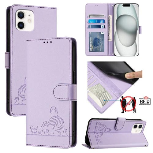 Funda para Teléfono Pu iPhone 12 Pro/12 Patrón Gato y Rata Rfid con Correa (Morado)
