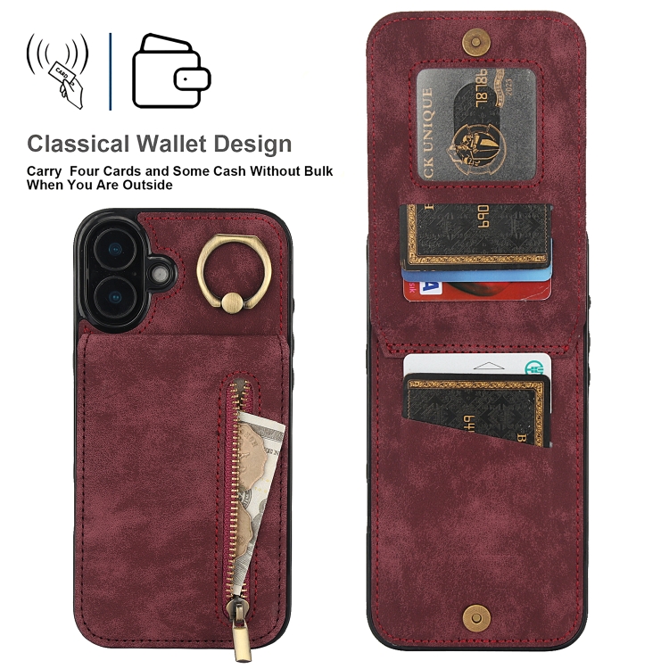 Funda para Teléfono iPhone 16 Plus Ranura Tarjeta RFID Anillo Retro Cremallera (Rojo Vino)