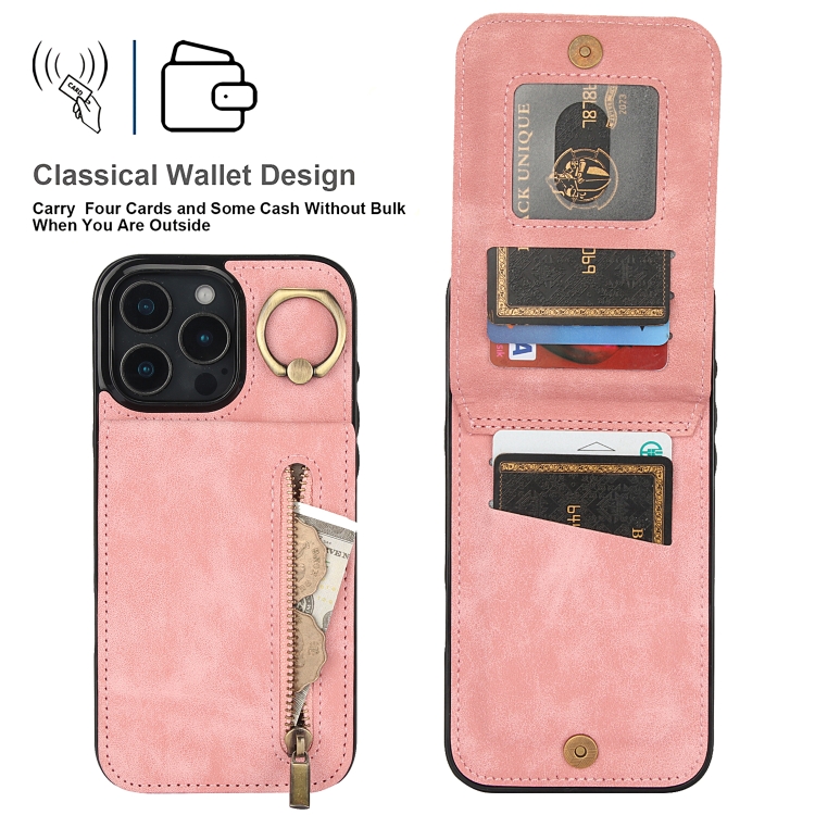 Funda para Teléfono iPhone 16 Pro Ranura Tarjeta Rfid Anillo Retro Cremallera (Rosa)