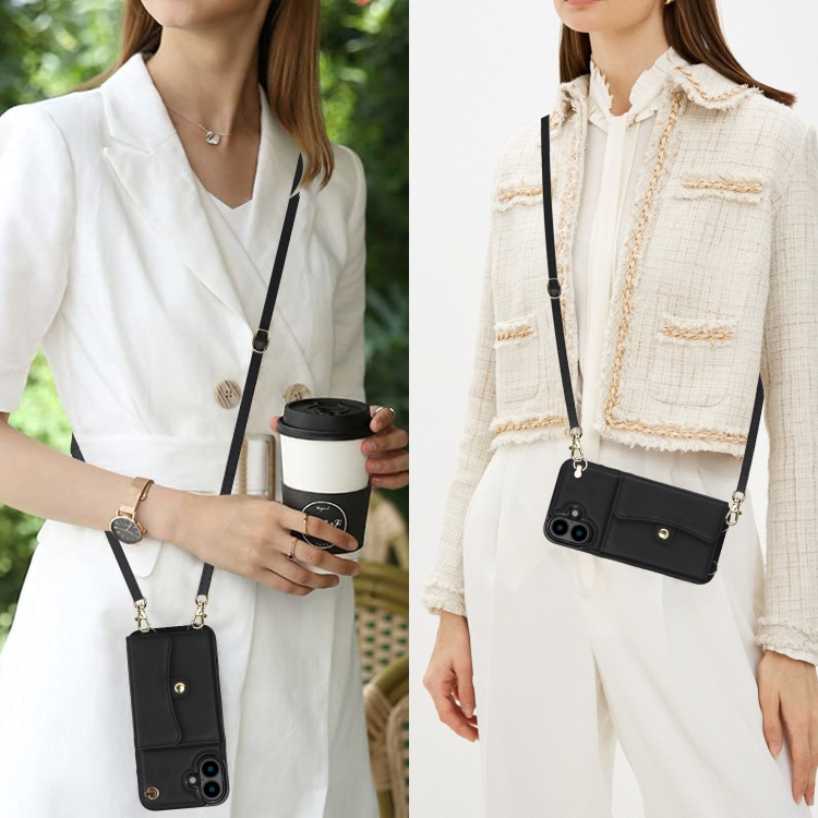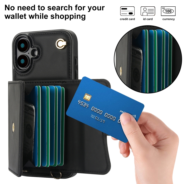Funda para Teléfono iPhone 16 Plus Ranura Tarjeta Rfid Cordón Largo (Negro)