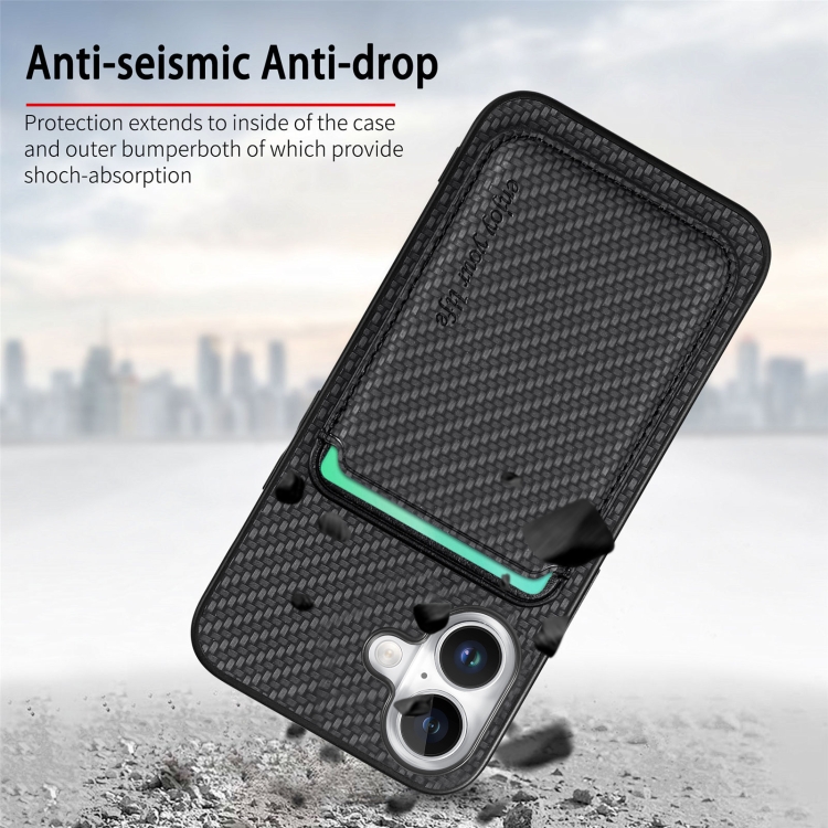 Funda para Teléfono con Tarjetero de Cuero Fibra de Carbono y Magsafe para iPhone 16 Plus (Negra)